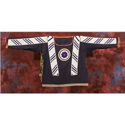 Blackfeet Warshirt. 54" x 25". White & cobalt beaded strips on classic cut navy trade cloth. Central beaded roundels on the front &...
