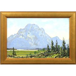 Conrad Schwiering (1916 - 1986). Mount Moran Across Willow Flats. 12" x 18" oil on board. Signed lower right: Schwiering [Indian Paintbrus...