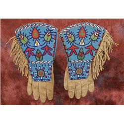 Plateau Gauntlets. 13.5" x 7.5". Classic fully beaded designs over commercial gloves. Lined with trade cloth. 3" fringe. Circa 1920s....
