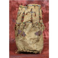 Sioux Medicine Bag. 20" x 13.5" cylindrical bag. Made from two calves' heads. Eyes are beaded over with umbilical lizard fetish design...
