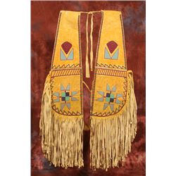 Blackfeet Crupper. Two 27" x 9.5" panels exhibiting finely beaded patterns & yellow pigment. Beautiful long fringe measuring 15"...