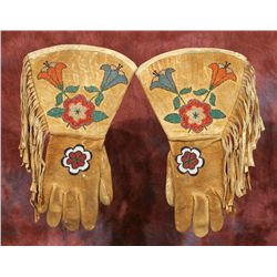 Crow Gauntlets. 14" x 8" with 5" fringe. Partially beaded floral design. Appear to be beaded commercial gloves lined with trade cloth...