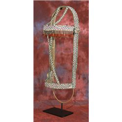 Sioux Bridle. 19" x 7" fully beaded bridle with a quilled face band. On tanned hide. Quilled slats terminate in horsehair filled cones. 19...