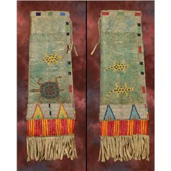 Crow Pants. 40". Beaded designs on Indian tanned hide. Fine, early style beadwork covering much of the front. Partially beaded on the back. Sho...