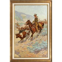 John Norval Marchand (1875 - 1921). Pointing The Beef Herd, Cattle Trail Series. 38" x 24" oil on canvas. Signed lower right: J N MARCHAND...
