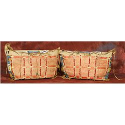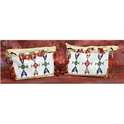Pair Sioux Possible Bags. 13" x 20" each. Exceptional, fully beaded front panels on Indian tanned hide. Beaded in colors of green, yellow,...