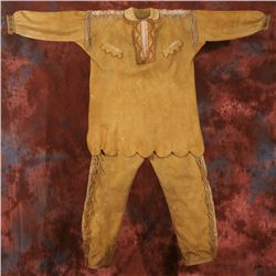 Metis or Cree Outfit. 40" long pants with quilled fringe. 65" x 32" shirt exhibits classic styling. Cut-out decorations on the pocket...
