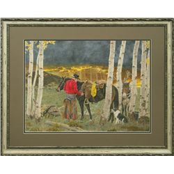 Raymond L. Knaub (1940 - ). Gathering For The Rabbit Hunt. 24" x 36" oil on canvas. Signed lower left: R. L. KNAUB © Condition re...