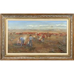 Bud Helbig (1919 - 2002) CA. Branding Time - Montana. 20" x 36" oil on canvas. Signed lower right: Bud Helbig 71. Condition reports ca...
