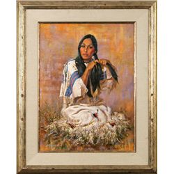 Jack Hines (1923 - ). Blackfeet Maiden. 24" x 18" oil on board. Signed lower left: jack hines © '99. Condition reports can be...