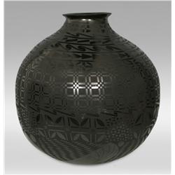 Mata Ortiz Monumental Pottery Olla. 14" x 14". Black on black fine line design by master potter Lacie Sete. circa 1990s, signed. (est $1,0...