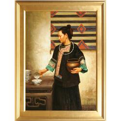 Jie Wei Zhou (b. 1962). Preparing for Guests. 40" x 30" oil on canvas. signed lower right. (est $15,000-20,000) Condition Report: Black...