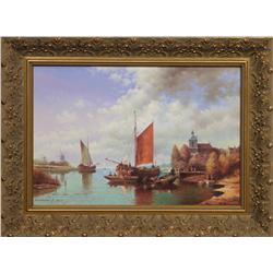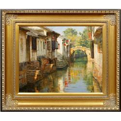 Jie Wei Zhou (b. 1962). Suzhou Canal. 16" x 20" oil on canvas. signed lower right. (est $4,000-5,000) Condition Report: Black lights cl...