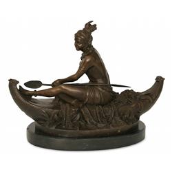 Duchoiselle (1800s). Indian Maiden in Canoe. Bronze Sculpture. 10" x 16" x 6 ½" on 1" marble base. Beautiful rich patina. (...