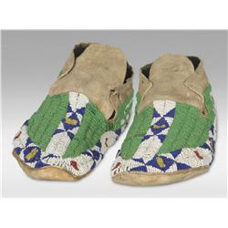 Sioux Moccasins. 10" long. Classic colors. 19th century. (est $800-1,000) Condition Report: Some discoloration to hide from wear and age. Be...