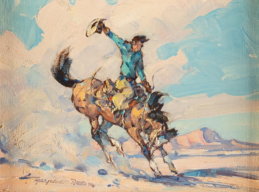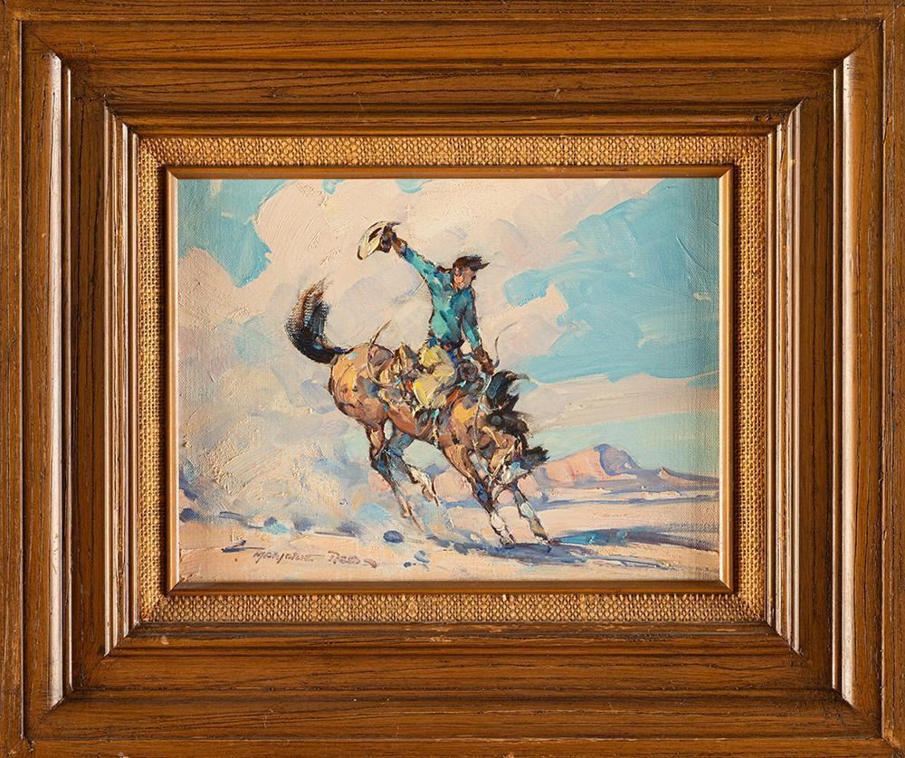 The bucking bronco is an iconic subject in Western art, symbolizing the rugged spirit, resilience, and freedom of the American West. Often depicted with a cowboy struggling to stay atop a wildly bucking horse, this image captures the raw energy and untamed nature of both the animal and the landscape. The bronc represents the challenges of frontier life, where man and beast must contend with each other and the unforgiving wilderness. Artists like Charles M. Russell and Frederic Remington popularized this theme, using dynamic brushwork and vivid detail to convey motion and struggle. The bucking bronc has since become a cultural emblem of the West, celebrating the courage, skill, and determination of cowboys while evoking nostalgia for a time when the American frontier was vast and untamed. This imagery continues to resonate, appearing in rodeo posters, sculptures, and paintings, reflecting the enduring legacy of Western heritage and values.