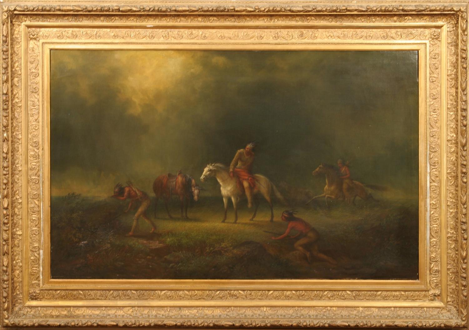 Mark R. Harrison (1819-1894). The Lost Trail. 29" x 45" oil on canvas. signed & dated 1888 lower left. (est $5,000-7,000) Condition Report: Black light indicates 5% inpainting around and below brown horse on left. Otherwise in good condition and in an antique gold frame