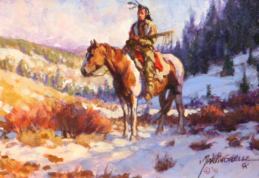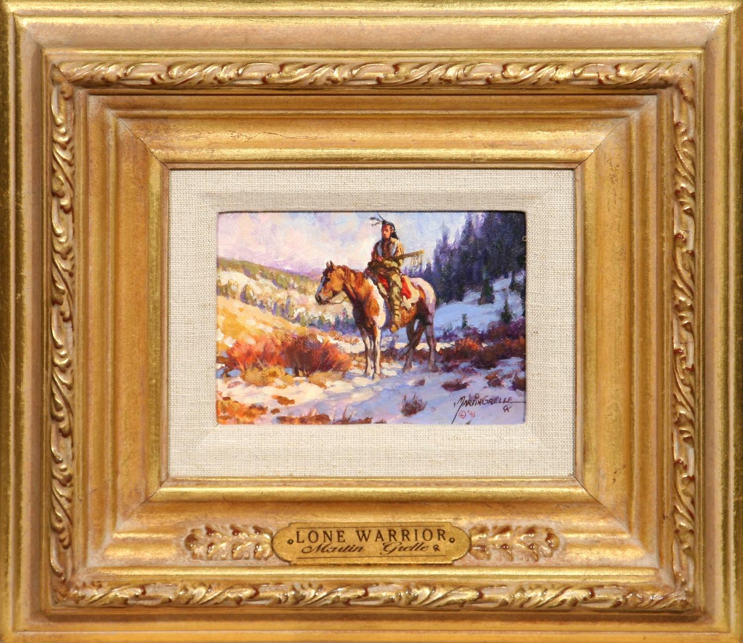 Martin Grelle (b. 1954), CAA. Lone Warrior. 5" x 7" oil on canvasboard. signed & dated 1996 lower right. (est $3,000-5,000) Condition Report: Black lights clean and in fine gold frame
