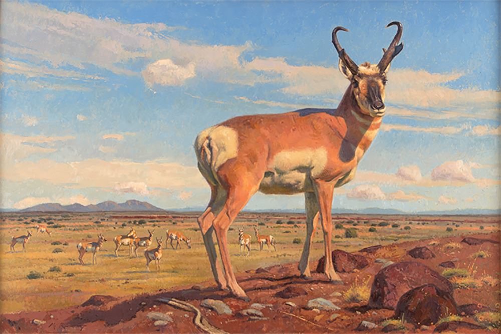 Michael Romney. Pronghorn Country. 20" x 30" oil on board. Signed lower left: M. Romney. Verso: Signed, titled and dated 2007. Provenance: Estate of Ken Holm, Denver, CO.