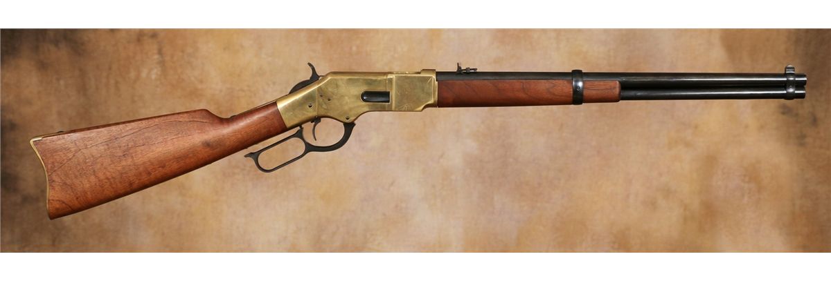 Model 1866 Uberti Yellowboy Carbine. .44-40 calibre. 19" barrel. Brass frame. With saddle ring. Front and rear sights. Barrel stamped for Uberti and Navy Arms. Serial #42205. This piece will require an FFL dealer transfer. Fees will apply. See terms and conditions. March In Montana does not allow the sale of any firearms outside of the U. S.
