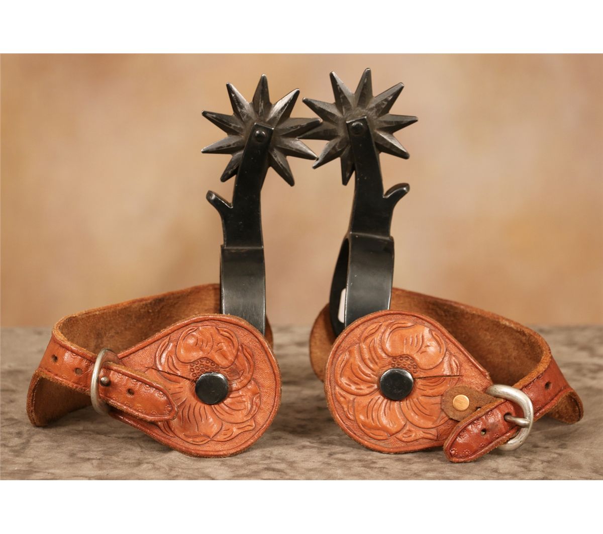 Montana Style Spurs. 6.5" overall length with 2.5" ten point rowels. Iron with silver overlay, single mounted. 3" wide heel band. Reminiscent of Eddie Hulbert. Floral carved straps. Circa 1930s - 1940s.