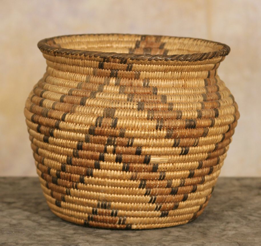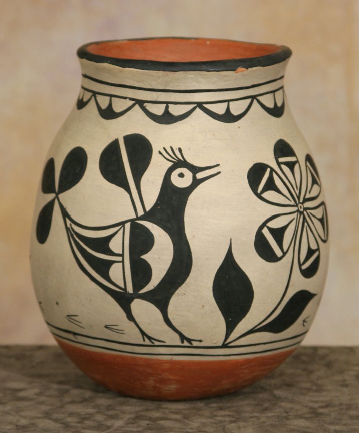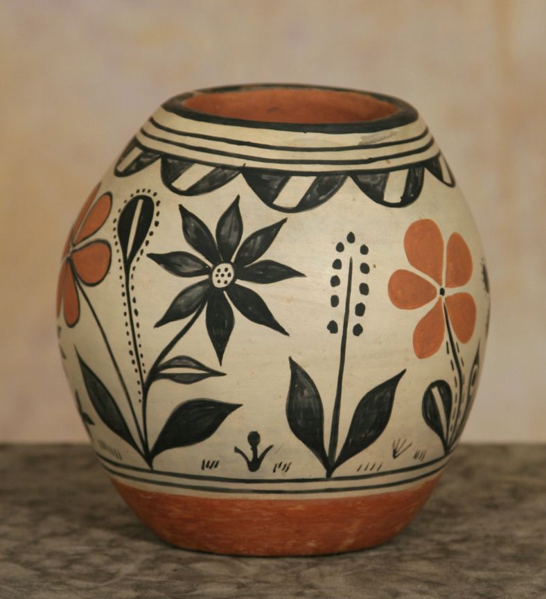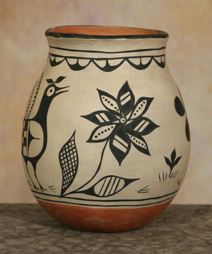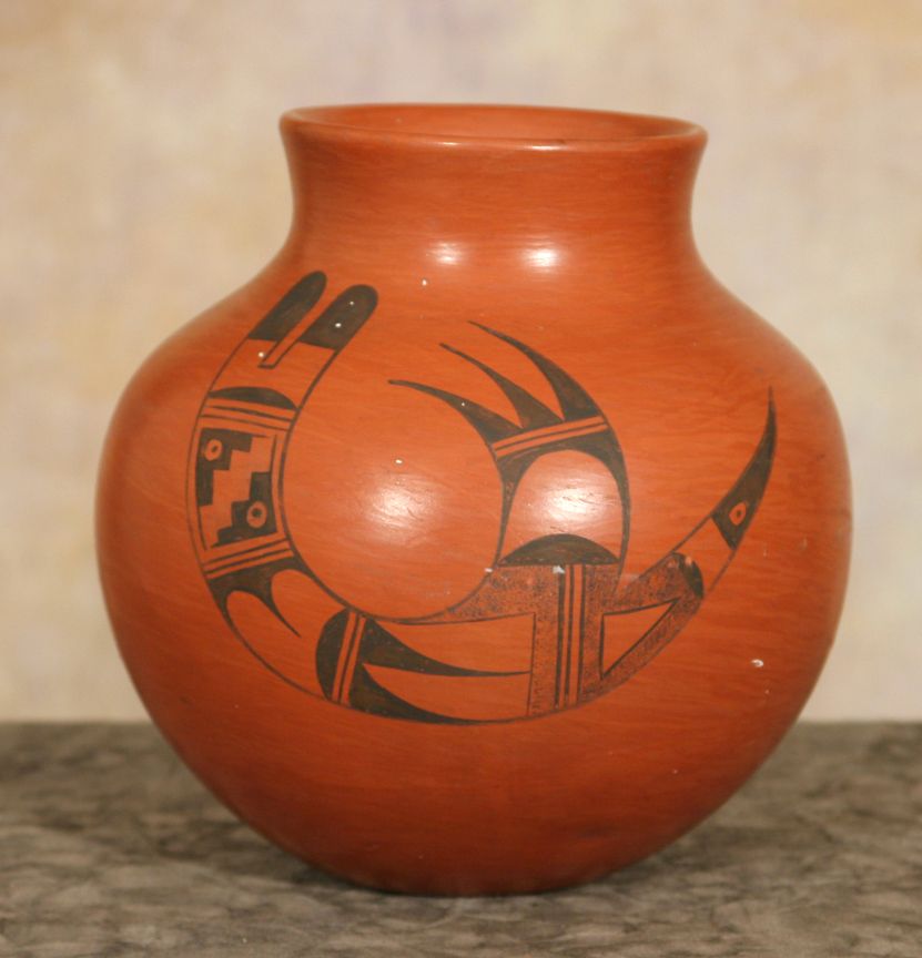 Hopi Red on Black Jar, 7.25" x 7", by Lorna Lomakema (Sadie Adams' daughter). Santa Clara Carved Vase, 8" x 6", by Celes & Legoria Tafoya. Santo Domingo Jar, 7.5" x 6.5", by Crucita Melchor. Santo Domingo Pot, 6" x 5.5", by Crucita Melchor. Pima Basket, 6.25" x 7.75". Provenance: Ex-Collection Burt Reynolds, Florida. Condition reports can be viewed at www.marchinmontana.com/docs/2013CR.pdf