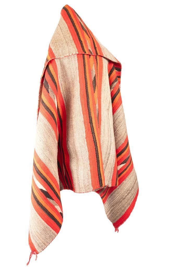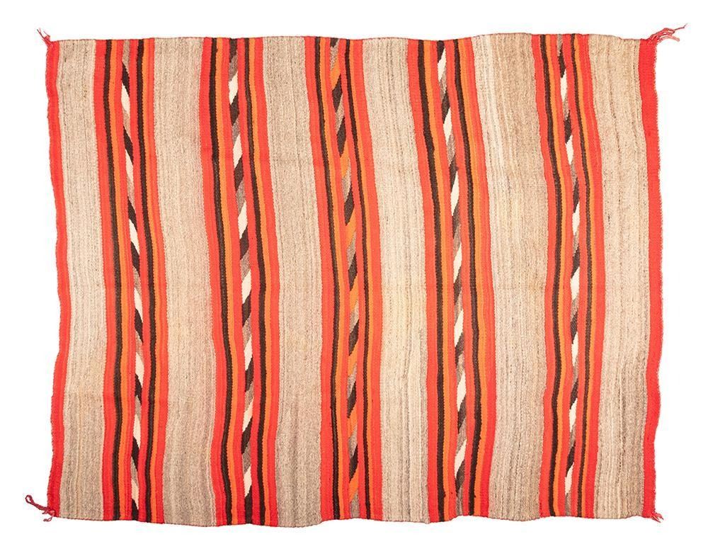 6'4" x 4'9" thick and soft Transitional blanket. Classic banded pattern with variegated grey wools. Circa 1890.