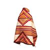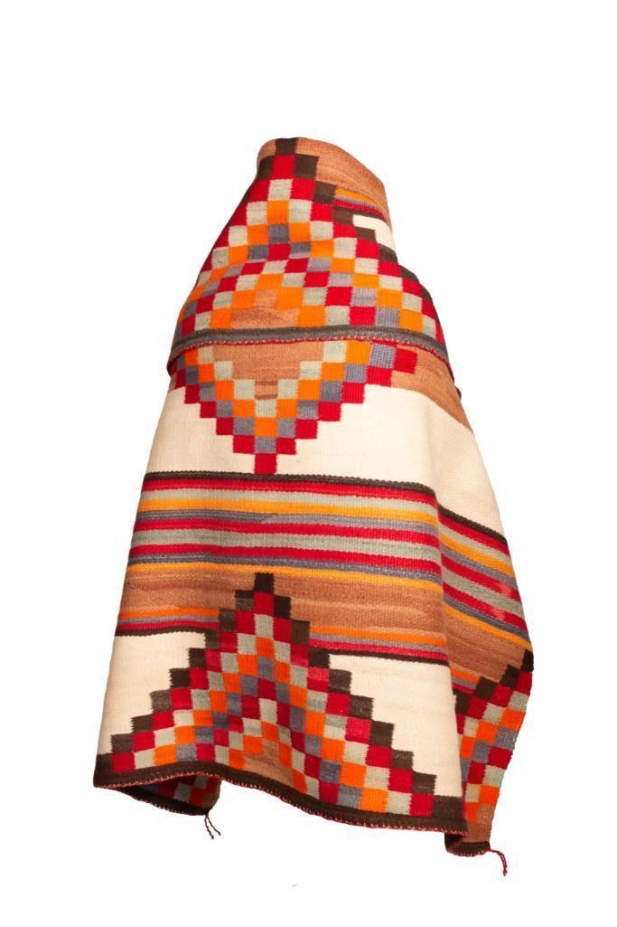 60" x 59" Transitional Chief's blanket with classic nine-spot layout on a bold scale. The nine half-diamond and quarter diamonds across each end merge across the end line. Wonderful checkerboard design using eight individual colors. A very visual piece. Woven from long-staple, Native handspun Churro cross sheep wool, both warp and weft. Circa 1900.
