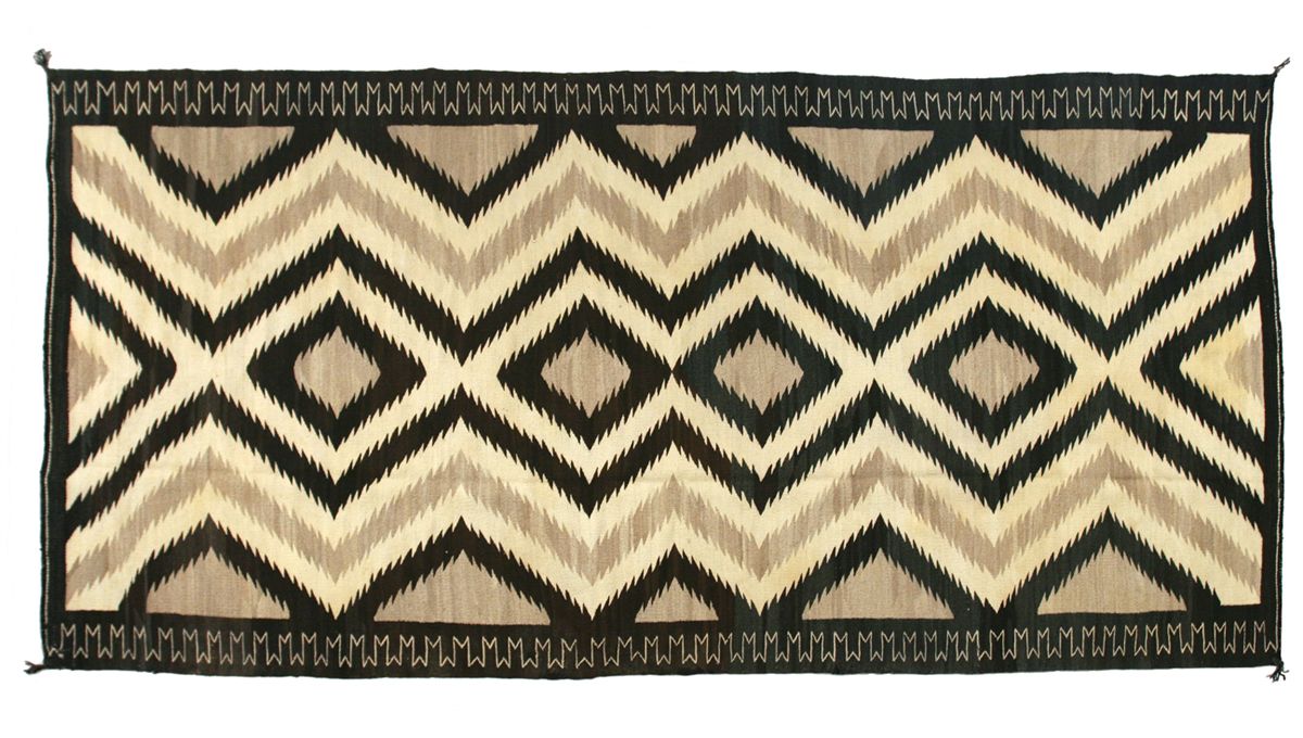 Navajo Weaving. 10'8" x 5'2". Large Churro wool Crystal runner in all natural colors. The design is a full length serrated concentric diamond layout with a swallow tail motif along all of the side borders. Circa 1930s. Condition reports can be viewed at www.marchinmontana.com/docs/2013CR.pdf