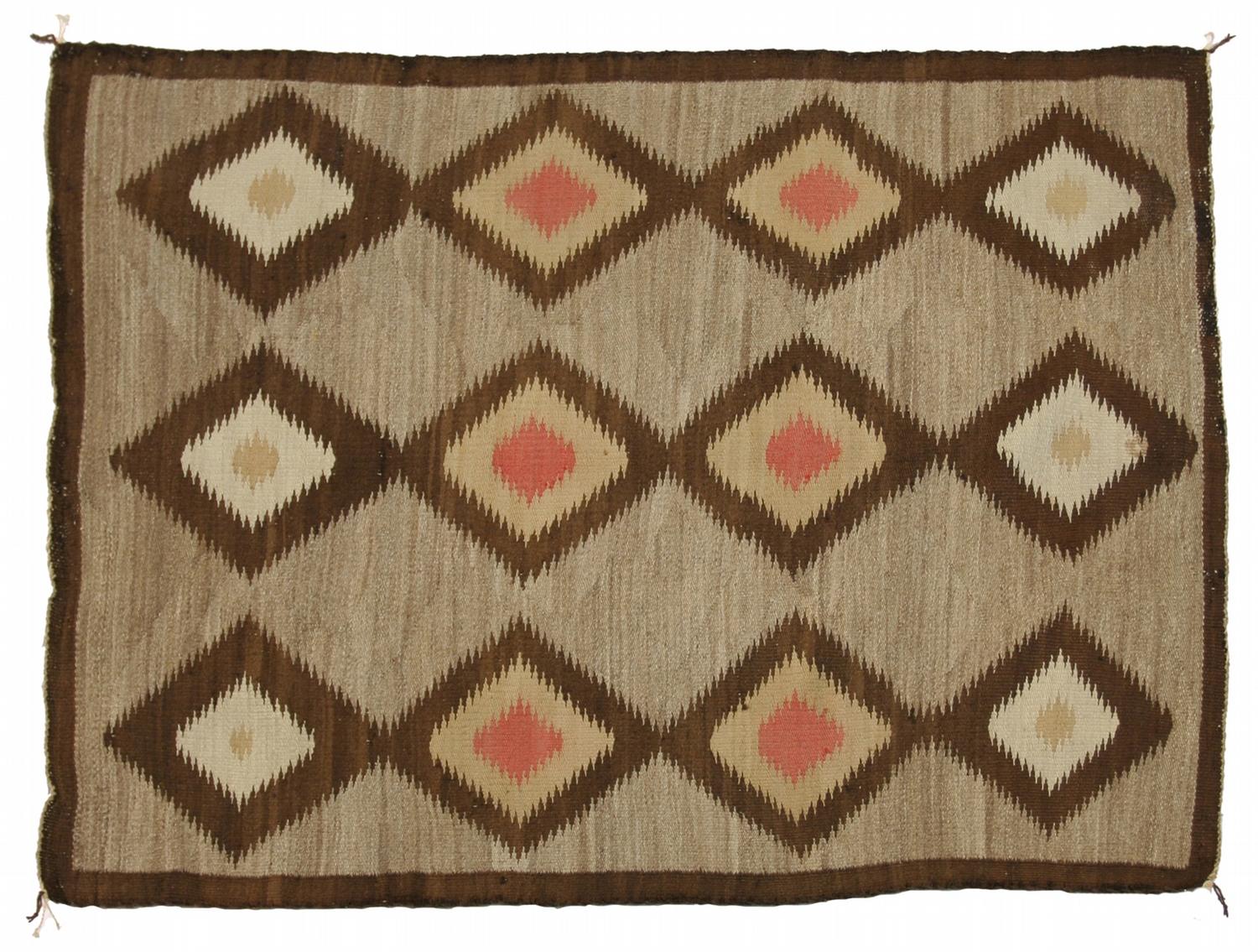 Navajo Weaving. 68" x 50". woven with Native handspun Churro wool. Crystal. circa 1920s. (est $400-600) Condition Report: Discolored-could use a good cleaning. No A/B sides