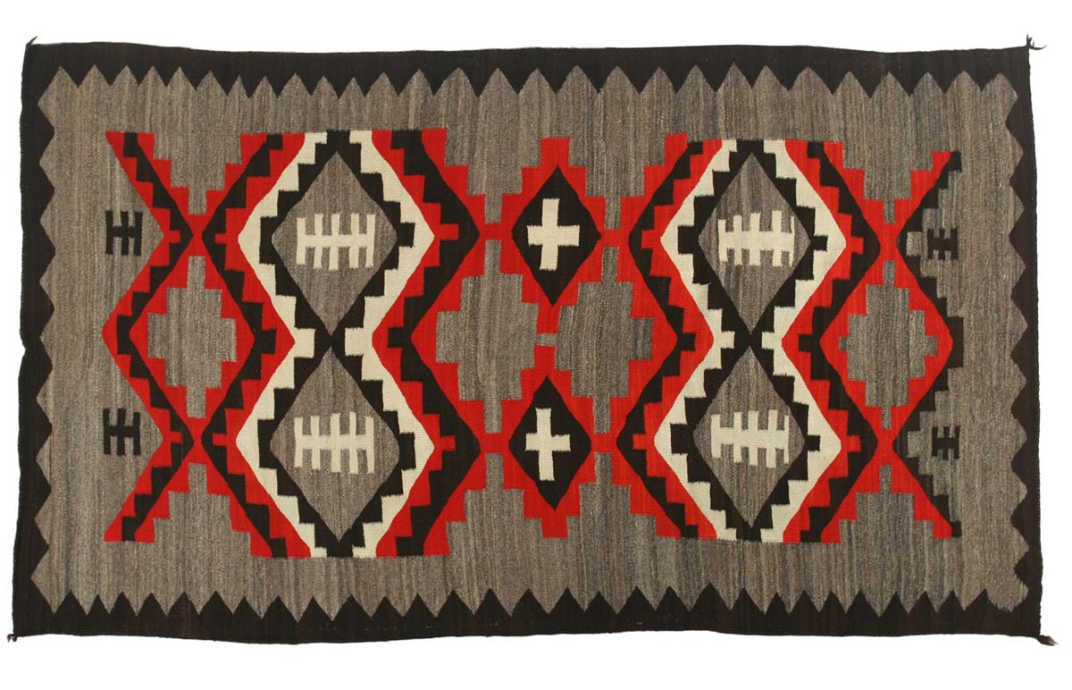Navajo Weaving. 8'4" x 4'10". Striking, old Ganado floor rug in vibrant colors with a gorgeous brown-grey field. Woven from old long staple Churro sheep wool. The design is a classy old Ganado with stepped & fine line diamonds, surrounded by a zigzag meandering saw-tooth border. Circa 1910. Condition reports can be viewed at www.marchinmontana.com/docs/2013CR.pdf