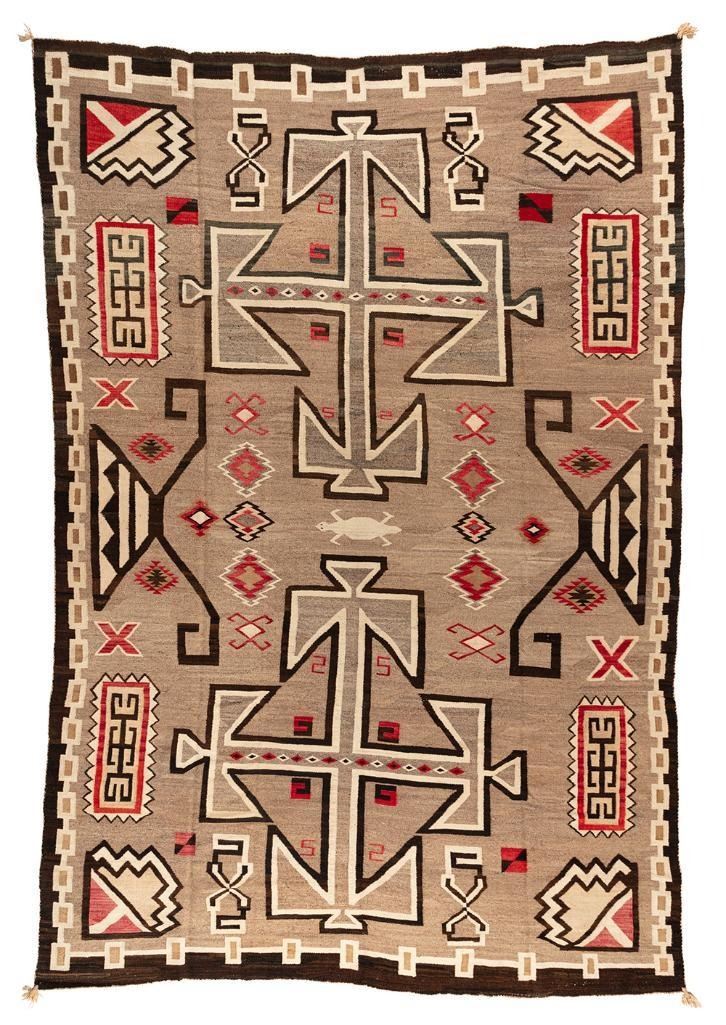 10'10" x 7'3" "Montana-sized" Crystal area weaving filled with pictorial and geometric design elements. An otter is central in the weavings expansive hand-carded, highly variegated gray-tan field. It is woven from all Native hand-carded and hand-dyed long staple Churro sheep wools.