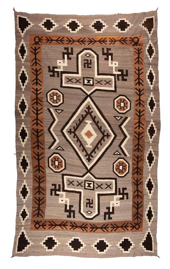 10'4" x 6'. J.B Moore weaving based on Plate XXX from the J.B. Moore catalog. Features a central diamond, varying design elements including modified waterbugs, rolling logs, stepped diamonds and zigzag patterns. Circa 1910.