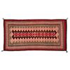 119" x 60" Churro Bisti weaving with a wide, multi-layered border, typical of Bisti. Features various design elements including red, outlined triangles, circles, and a chocolate brown color. Woven from Native, handspun, smooth, old, long-staple Churro sheep wool. Circa 1920.