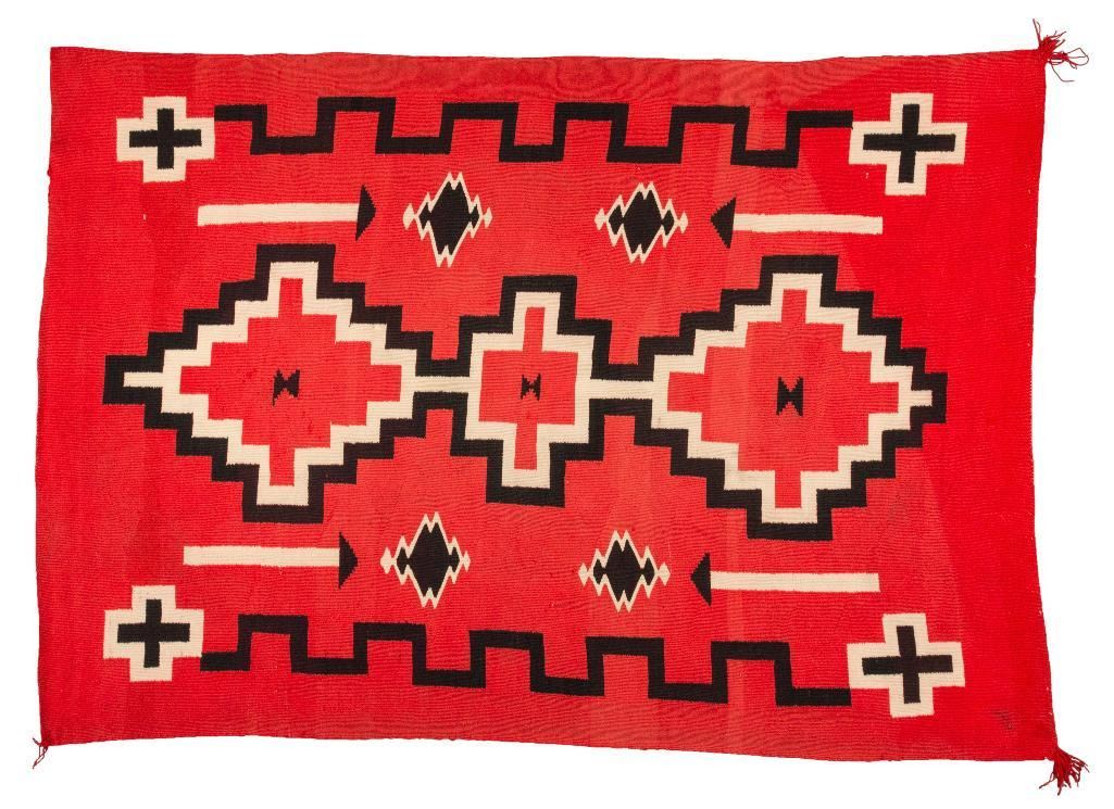 Navajo Rug 5'10" x 4'. Germantown weaving with cross designs and central stepped diamonds. Circa 1890. $4,500-5,500
