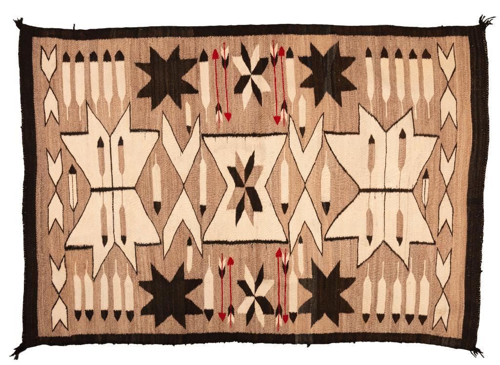 Navajo Rug 5'3" x 3'7". Pictorial weaving with Valero stars, arrows, and feathers. $1,500-2,000