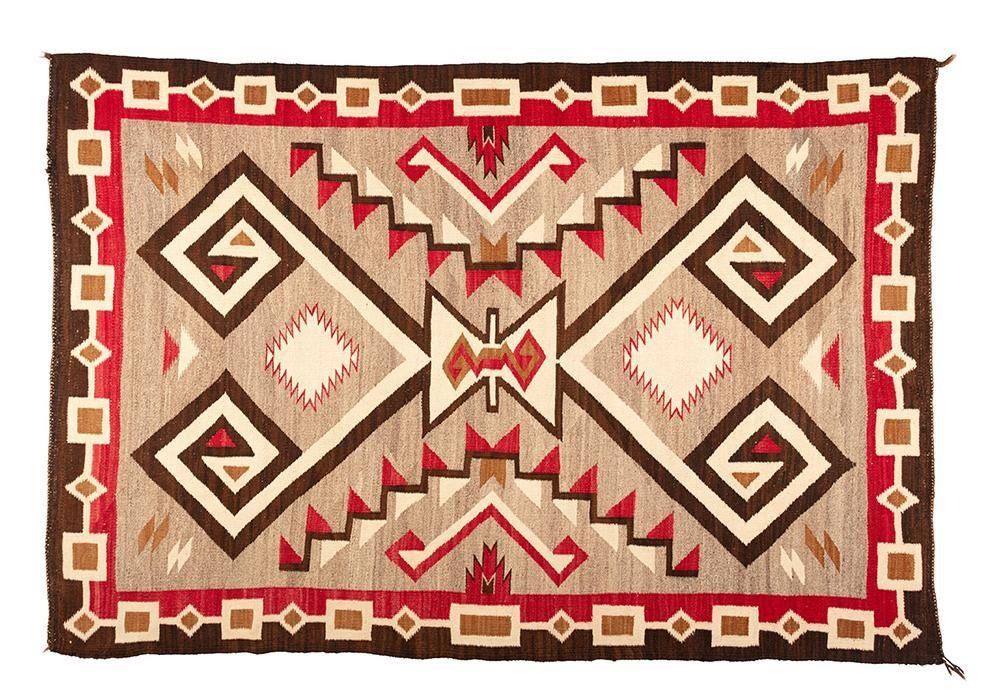 6'3" x 4'3" Crystal area Storm Pattern weaving with concho belt design border. Circa 1930.