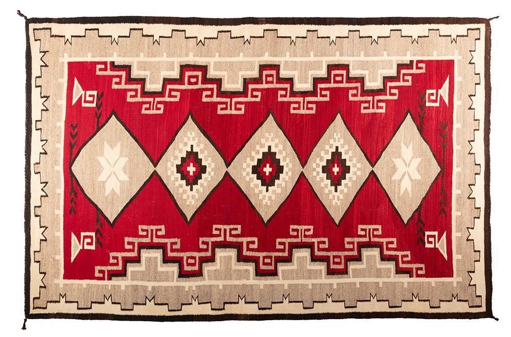 6'9" x 4'6" Ganado area weaving with five central stepped diamonds on a rich, red field. The border is an array of fancy geometric motifs. Woven from all Native handspun and hand-dyed long staple Churro cross sheep wools on a wool warp. Circa 1930.