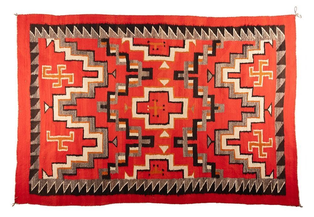 6'9" x 4'6" Ganado-Hubbell Trading Post area rug featuring geometric stepped half diamonds with whirling logs and spider woman crosses. The border is a nice inset reciprocal sawtooth motif. Hand woven from all Native long staple, smooth handspun and hand-dyed Churro sheep wools on a wool warp. Circa 1900.