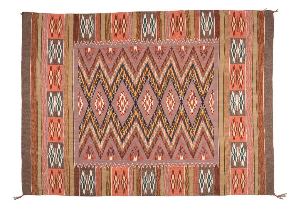 Navajo Rug 6'9" x 5'. Rug-in-a-rug design with exquisite eyedazzler designs in center. Together with 24 minor rug design elements along border. Exceptional designs and quality. $2,500-3,500