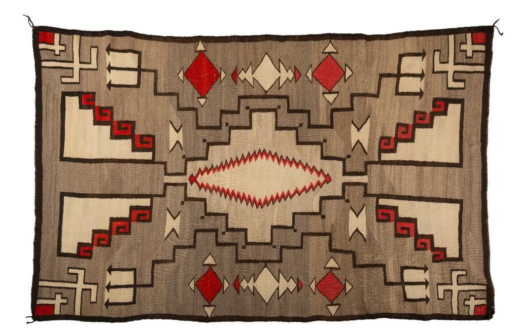 Navajo Rug 7'1" x 4'8". A nicely designed Crystal Storm variant with red accents and a one-of-a-kind design. Woven from all native hand-spun, long-staple Churro sheep wool on a wool warp. Circa 1920. $2,500-3,500