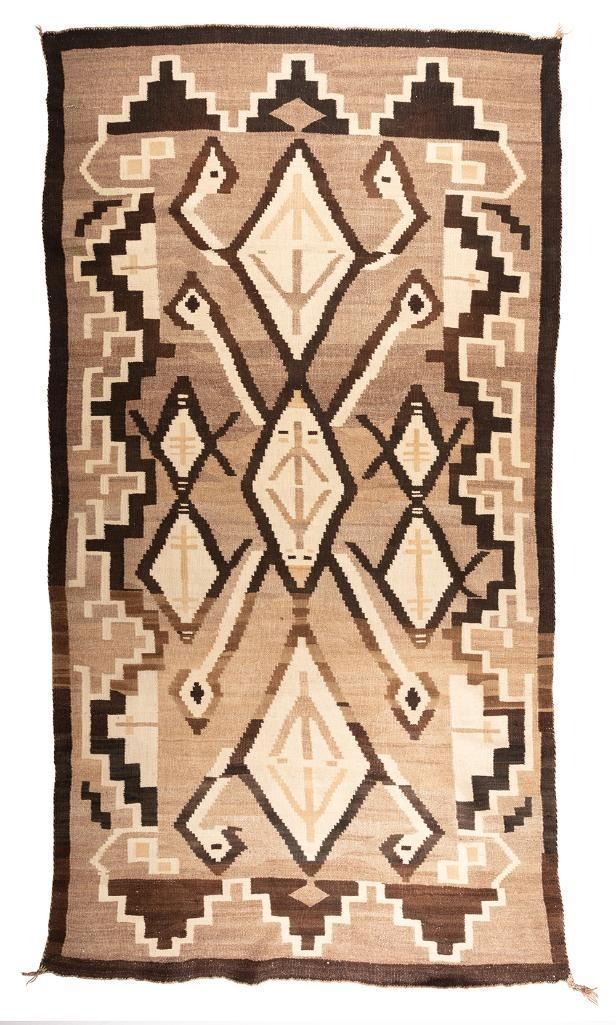 7' x 3'8" Crystal area weaving. A good sized pictorial rug with large waterbug motifs in the central field and turkey tracks in the central row of stepped diamonds. Woven from all Native hand-carded and handspun Churro sheep wools on a wool warp. Circa 1920.