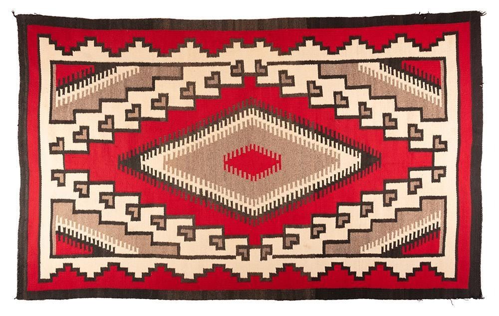 7' x 4'4" Ganado area weaving with a central sawtooth diamond surrounded by a stepped diamond and a stepped border.