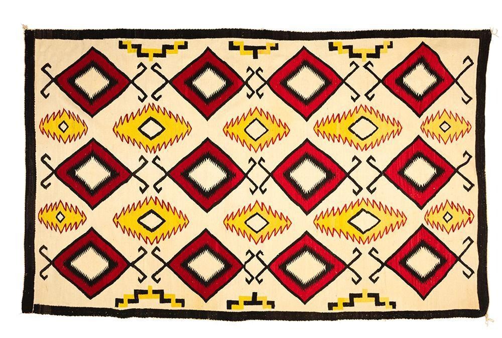 8'1" x 5'1" Crystal area weaving featuring 12 prominent waterbugs alternating with concentric yellow diamonds. Unusual color.