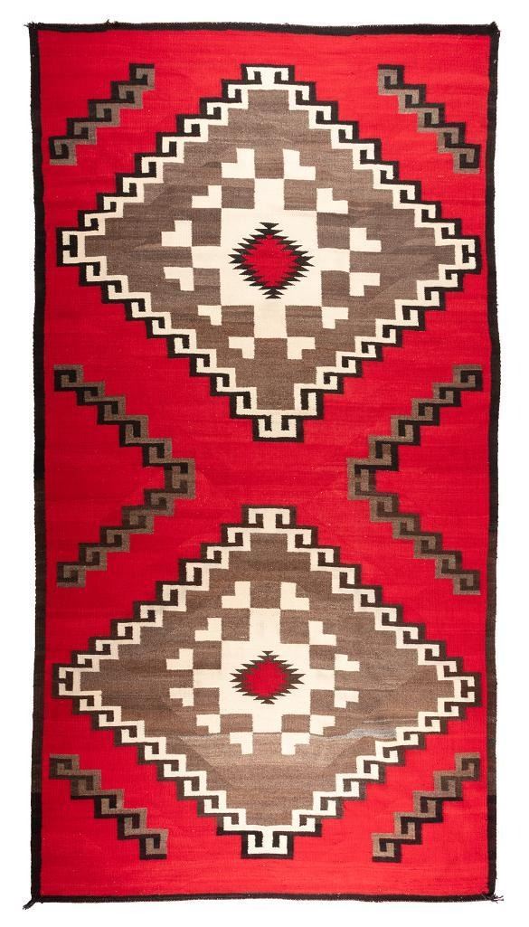 8'4" x 4'5" rug likely from the Hubbell Trading Post area. Features a stunning red field with two large diamond medallions. Woven from all Native, long staple, handspun and hand-dyed Churro cross sheep wools on a wool warp. Circa 1930.