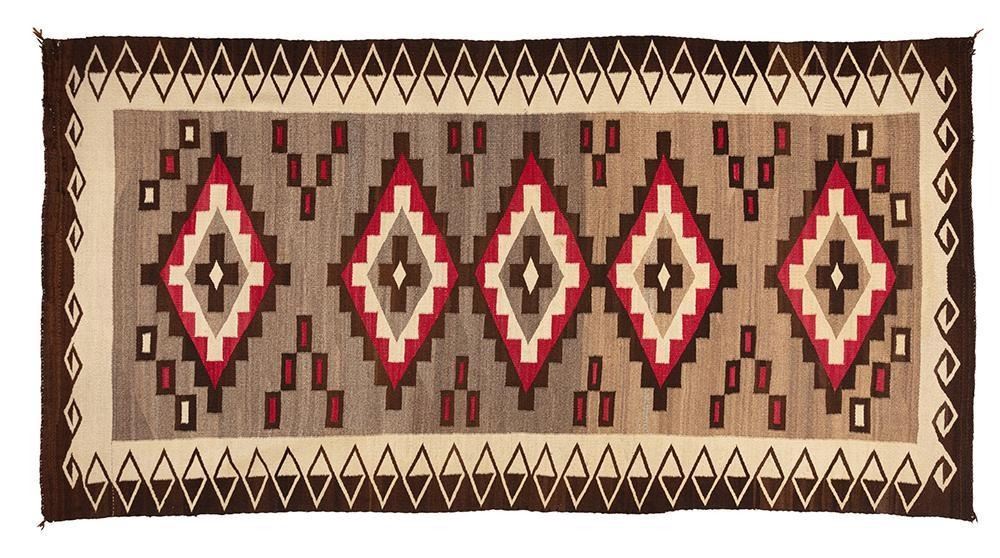 9'6" x 4'10" Klagetoh area weaving with 5 stepped diamonds running down the center, on a gray-brown background. Early 20th century.