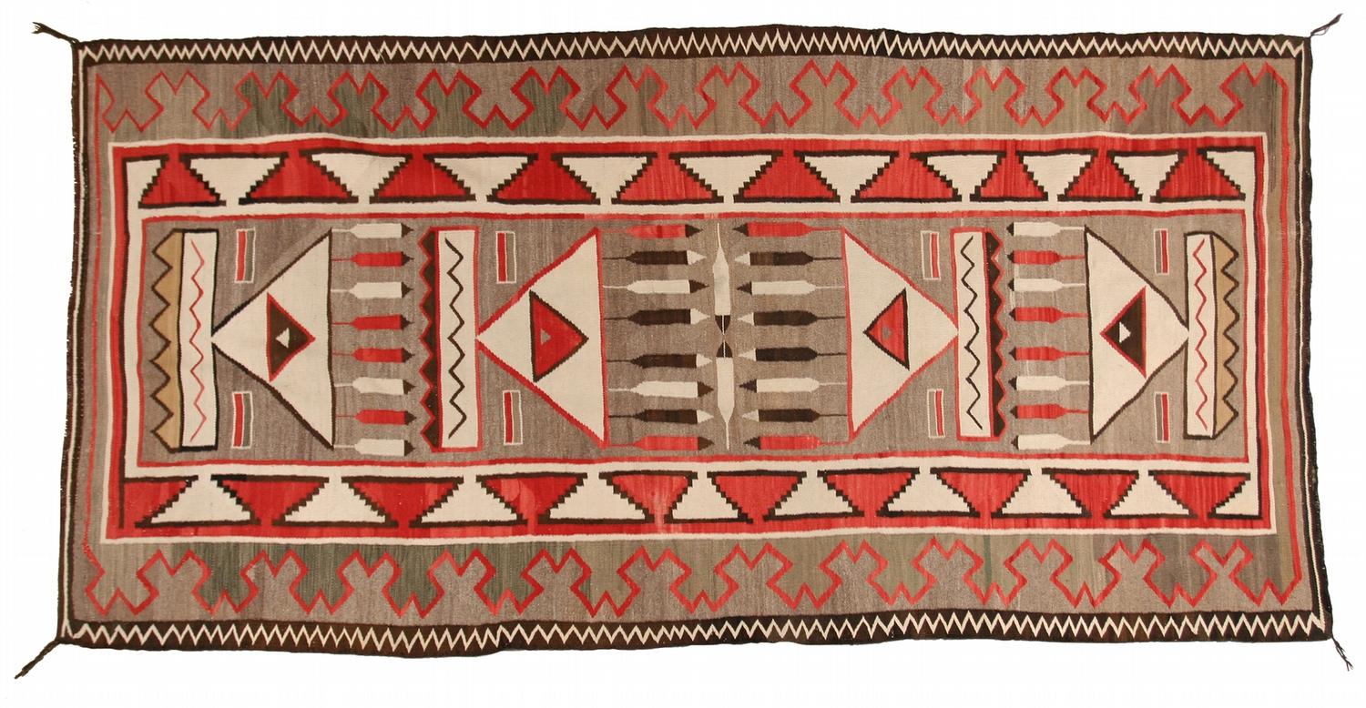 Navajo Weaving. 129" x 62". rare early Teec Nos Pos woven with Native handspun Churro & Merino wool. Bold triple border, beautiful grey field. circa 1920's. (est $3,500-4,500) Condition Report: Excellent condition