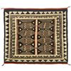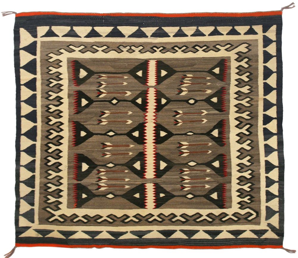 Navajo Teec Nos Pos Weaving. 4'11" x 4'5". Wonderful arrow & andiron pictorial elements, enclosed inside a wide double border. A nice bold orange stripe along the long edges. Circa 1920s-1930s. Condition reports can be viewed at www.marchinmontana.com/docs/2013CR.pdf