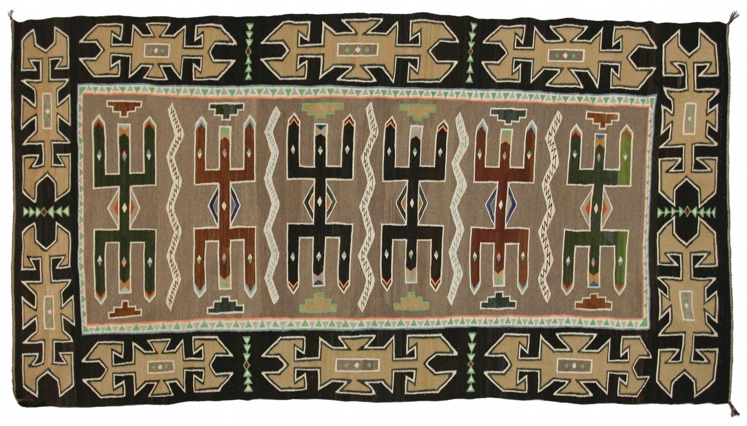 Navajo Weaving, Teec Nos Pos. 89” x 48”. Wide black border with large designs. Five lightning snakes divide six center design sundial elements. Excellent condition, 1925-1940. (est $6,000-8,000) Condition Report: Excellent condition.