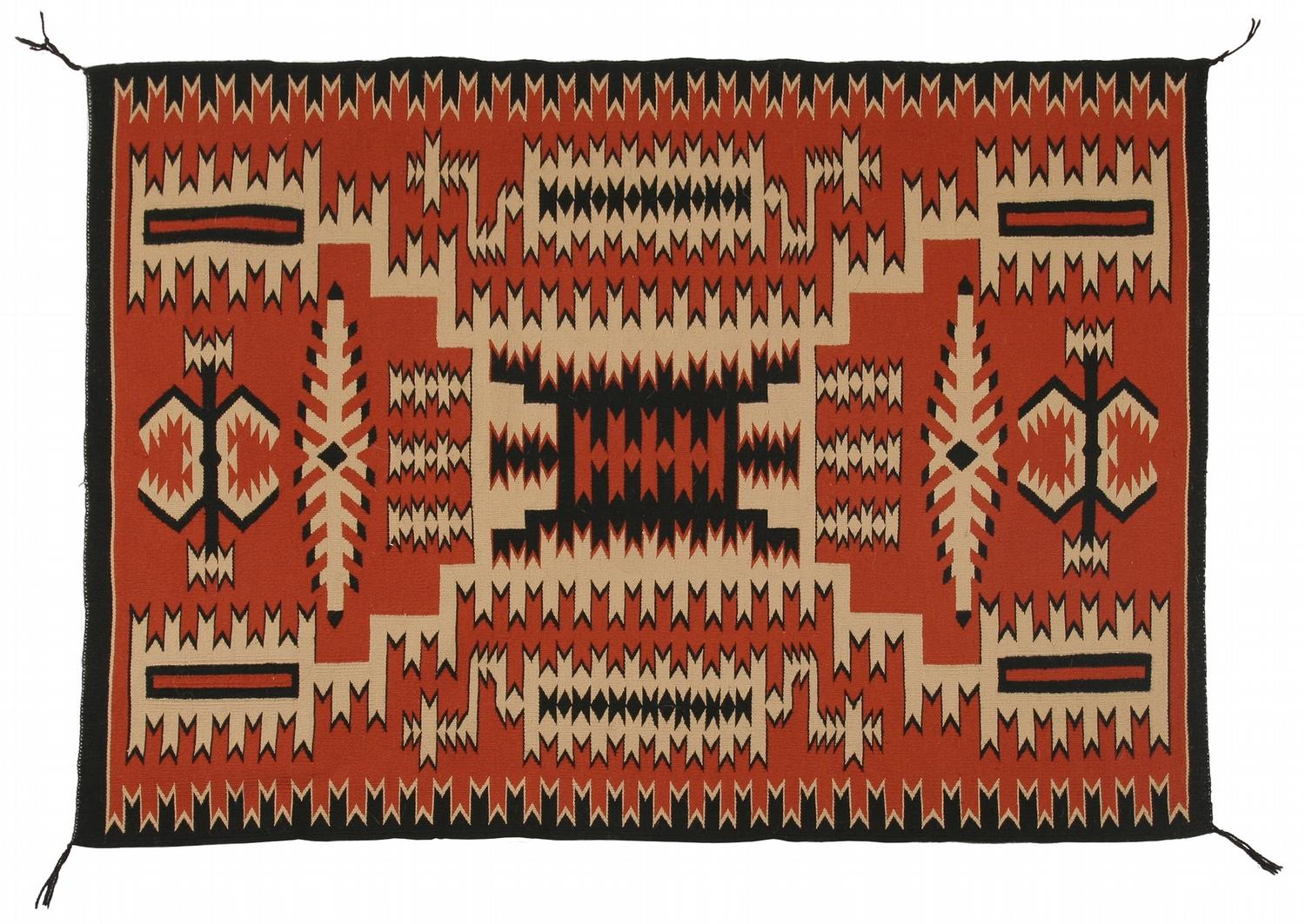 Navajo Textile. 64" x 45". Rust and black storm pattern. Extra fine weave. Circa 1940, excellent condition. (est $1,200-1,500) Condition Report: Excellent condition.